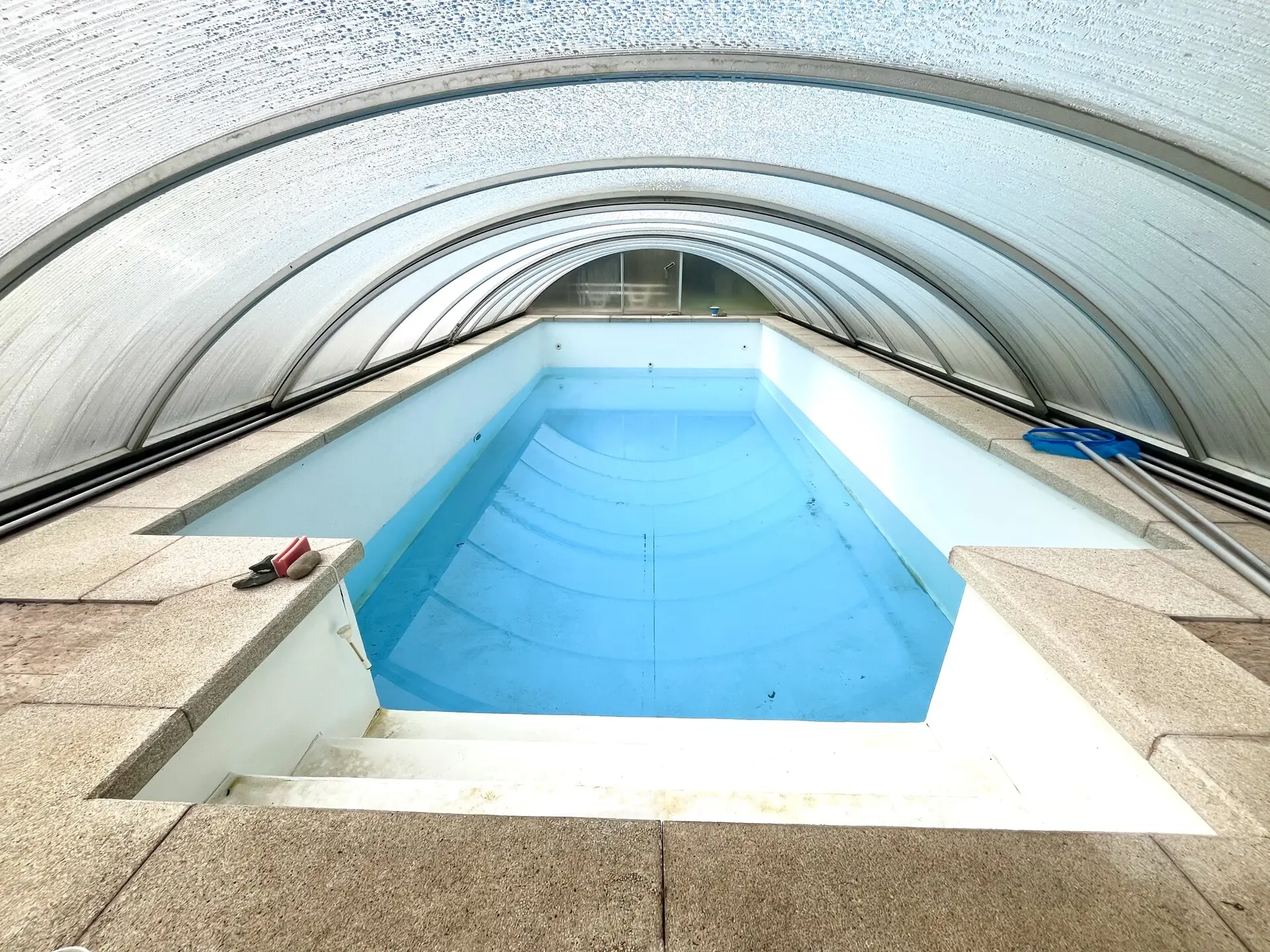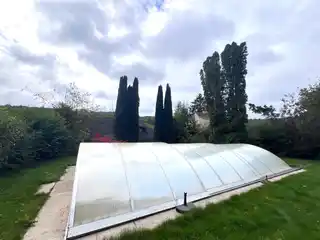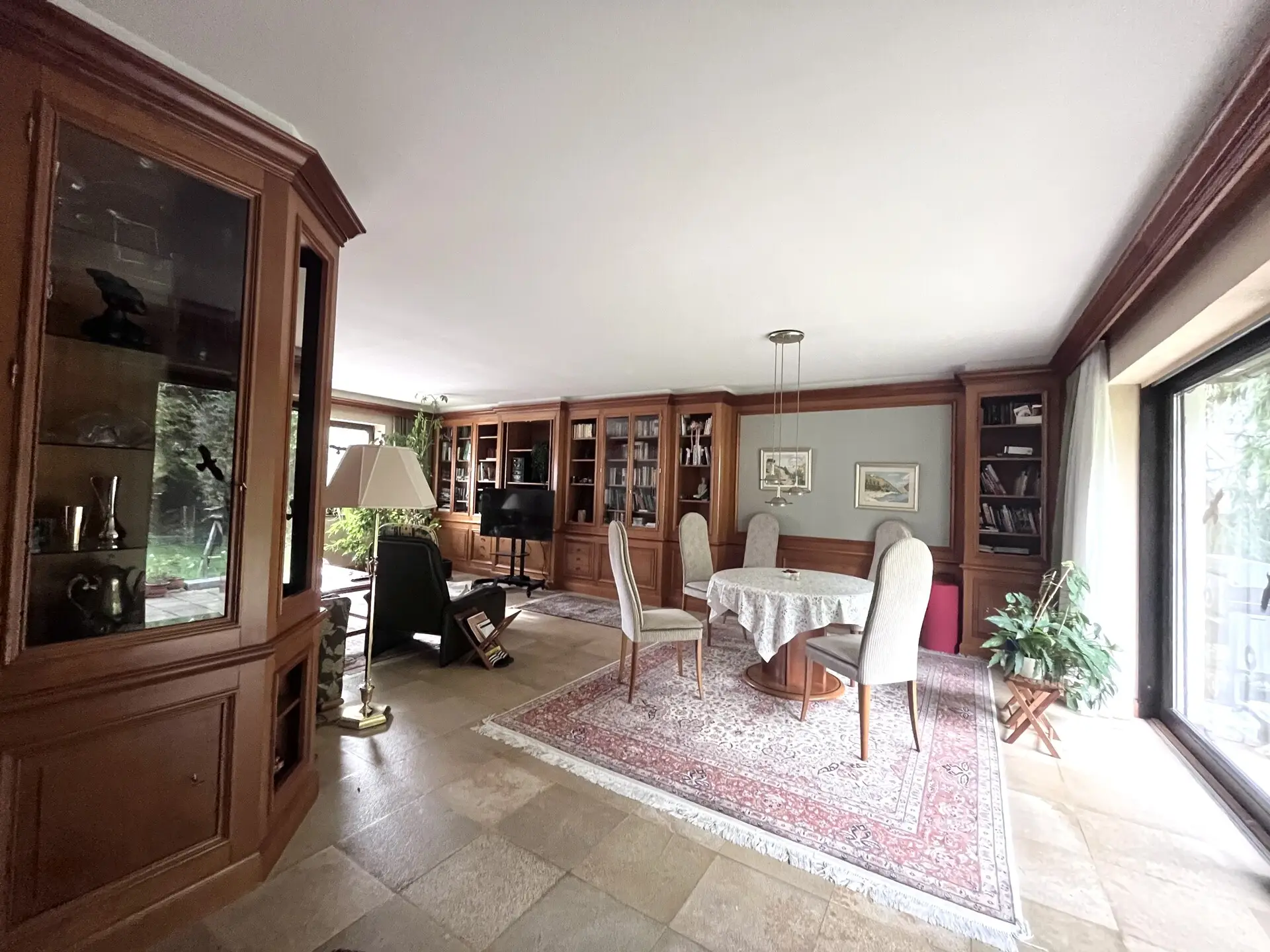 Von hier aus gelangt man auch auf die schöne Terrasse und den wunderbar angelegten Garten mit überdachten Pool.